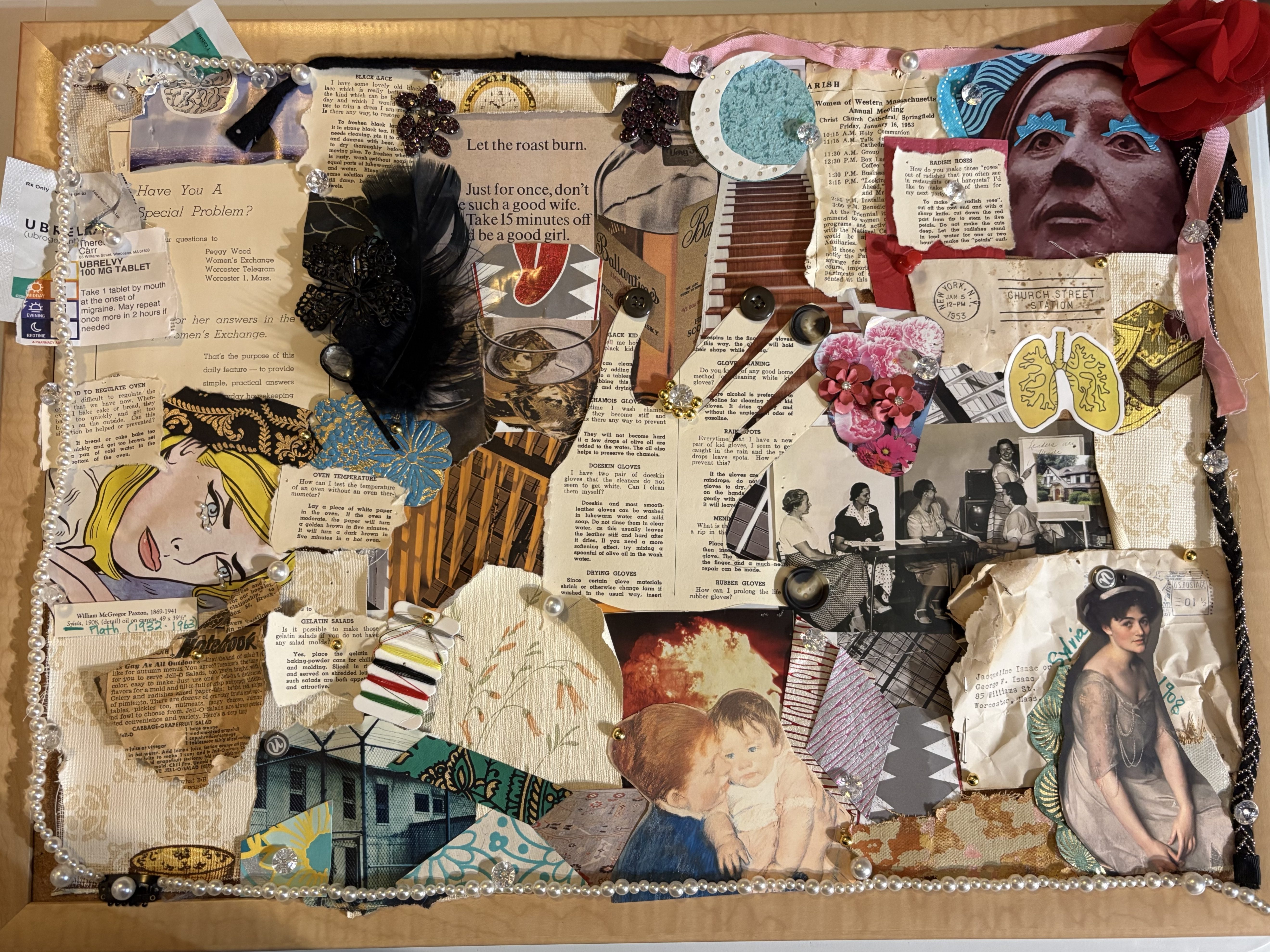 Let the Roast Burn, 2026, collage/mixed media (paper, wallpaper, newspaper, earrings, pins, buttons, and hair accessories on corkboard). Source Materials: The Worcester Telegram Homemaker’s Handbook (1950, 1959; “Let the Roast Burn” ad for Ballentine’s Scotch Whiskey from Newsweek, September 23, 1968; wallpaper and junkmail uncovered during kitchen renovation of c.1921 home in Worcester, MA.
