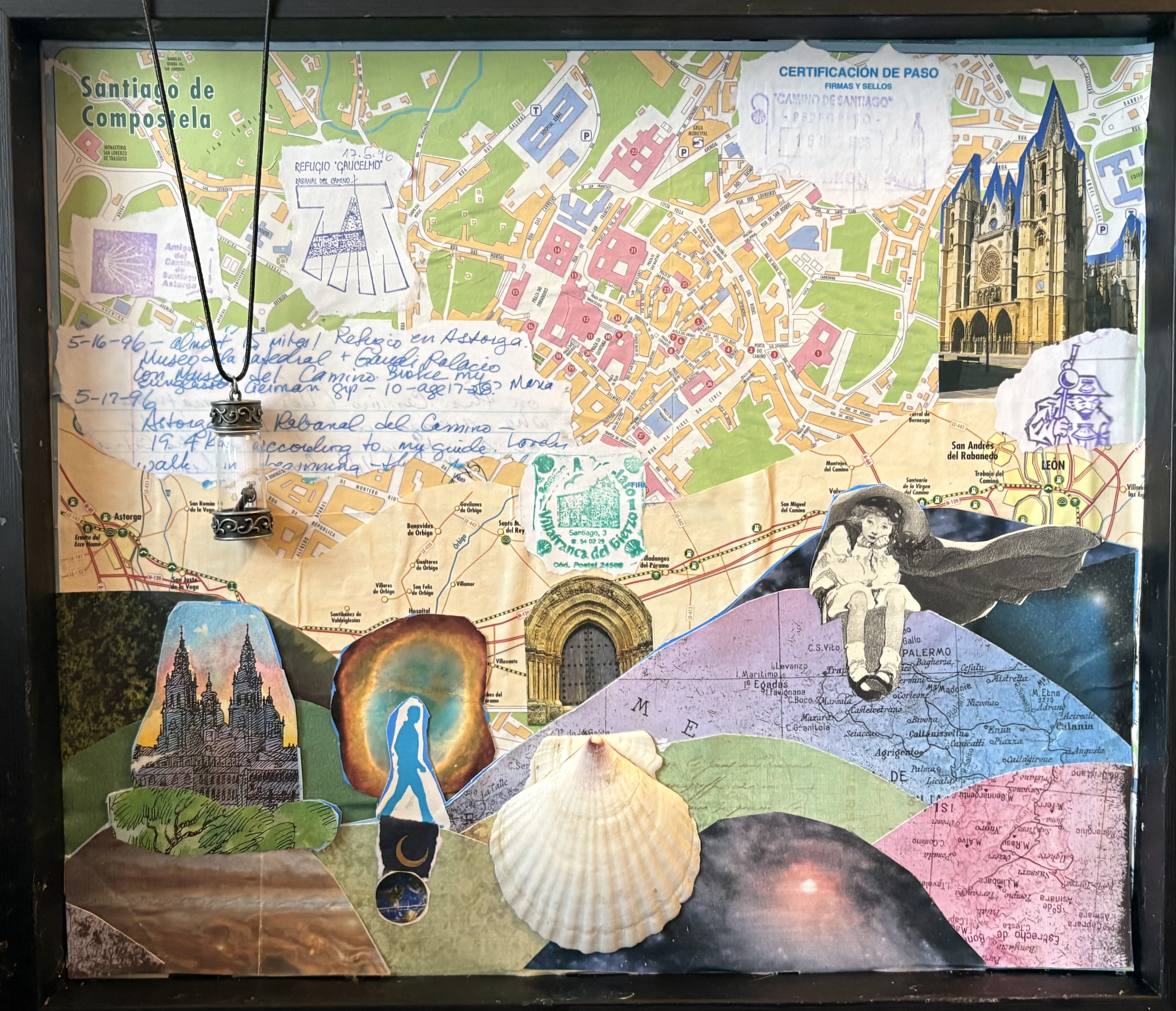Road of Stars, 2026, collage/mixed media (paper and 1996 maps/guides from the Camino de Santiago, jet and silver amulet, shell, and stamps reproduced from my 1996 journal and pilgrim’s Credencial from refugios for pilgrims along the route)